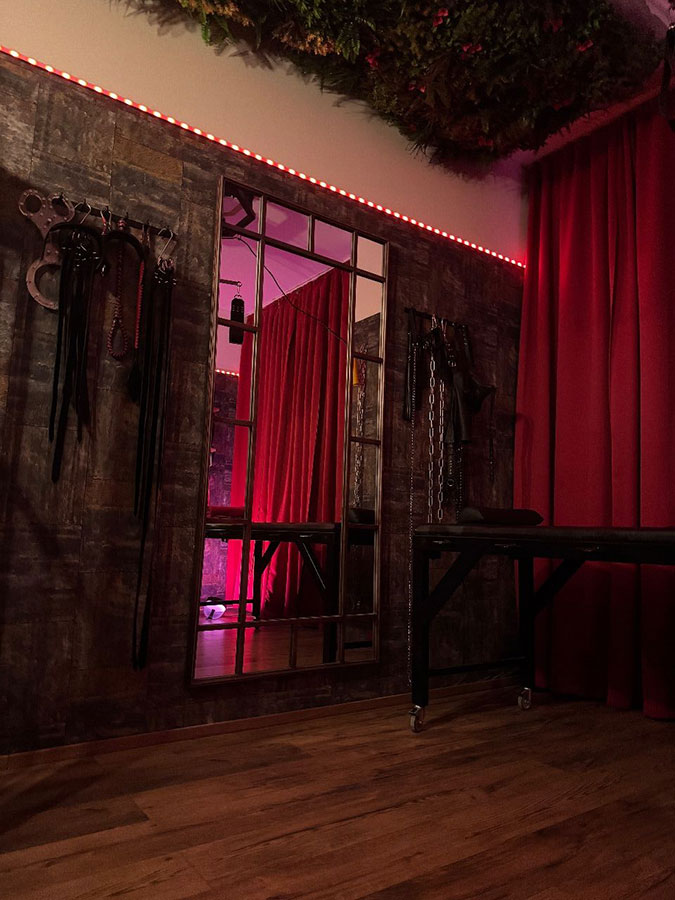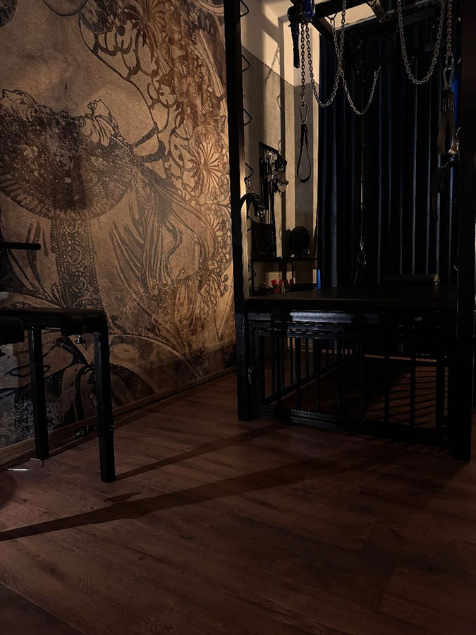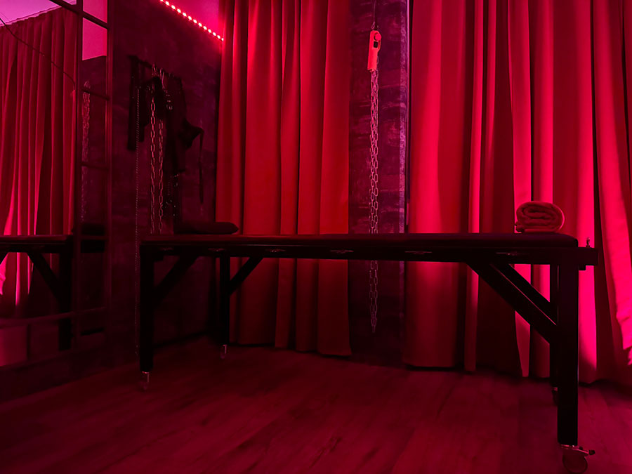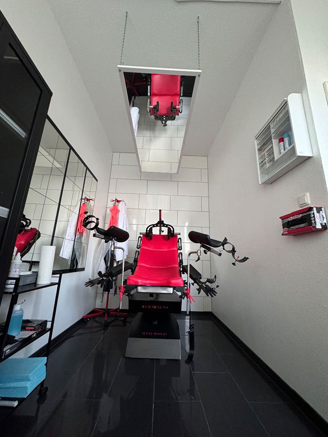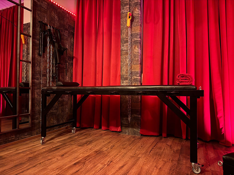 Der Rote Dungeon ist in ein tiefes, purpurrotes Leuchten getaucht und verleiht dem Raum eine unheimliche, sinnliche Atmosphäre. Die Luft ist voller Vorfreude und der Duft von Leder, Latex und Verlangen liegt schwer in der Luft, reizt deine Sinne und zieht dich tiefer in die Welt der Unterwerfung.
