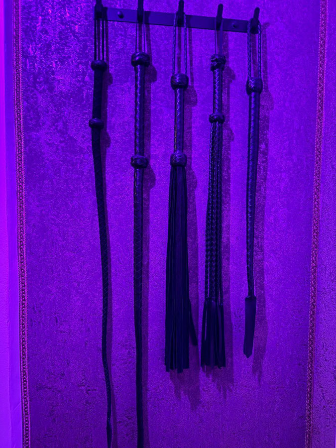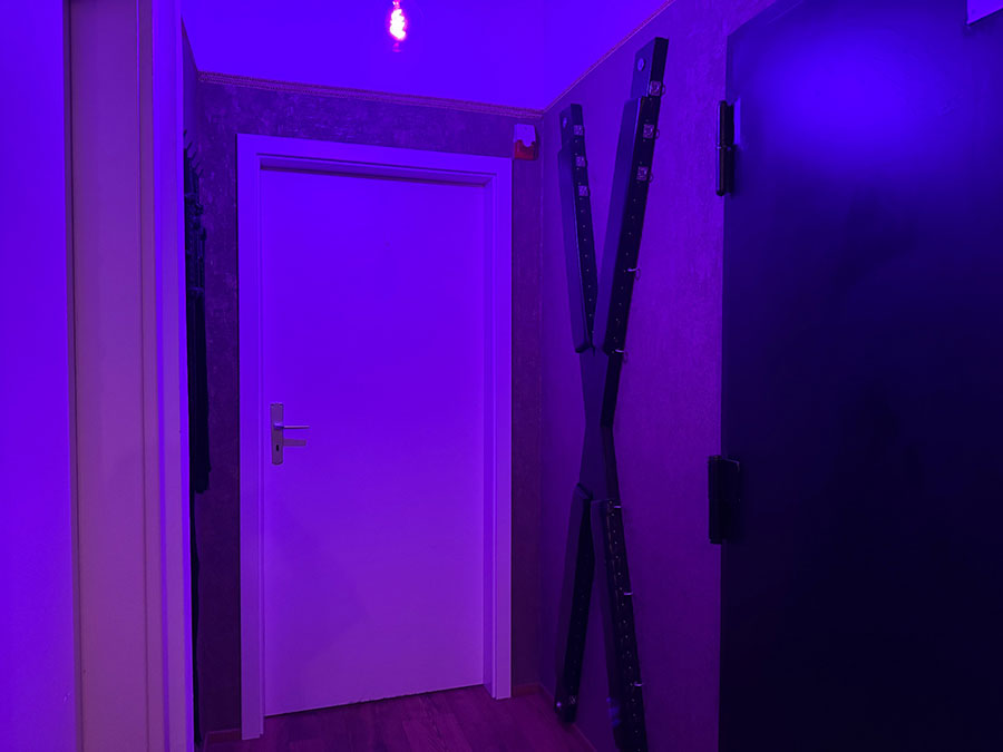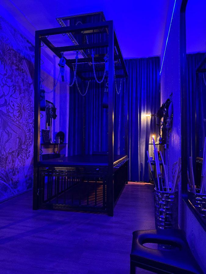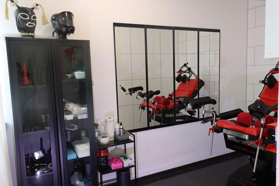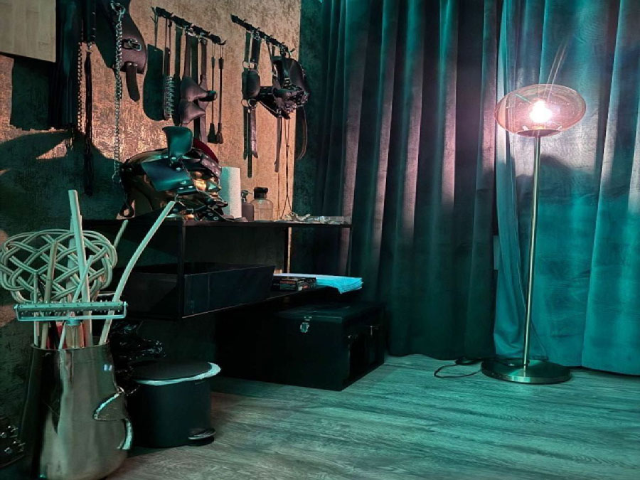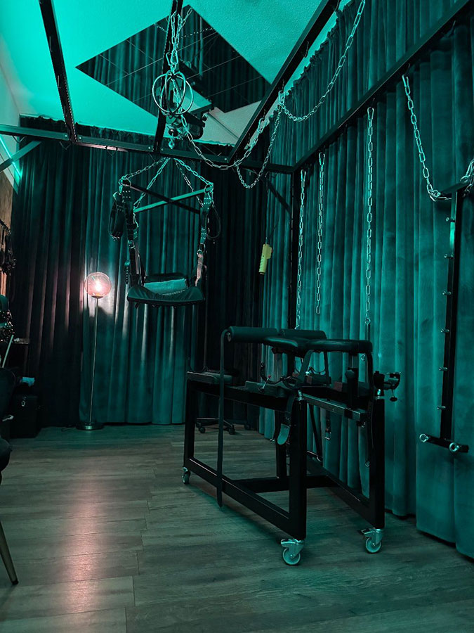 Der Rote Dungeon ist in ein tiefes, purpurrotes Leuchten getaucht und verleiht dem Raum eine unheimliche, sinnliche Atmosphäre. Die Luft ist voller Vorfreude und der Duft von Leder, Latex und Verlangen liegt schwer in der Luft, reizt deine Sinne und zieht dich tiefer in die Welt der Unterwerfung.
