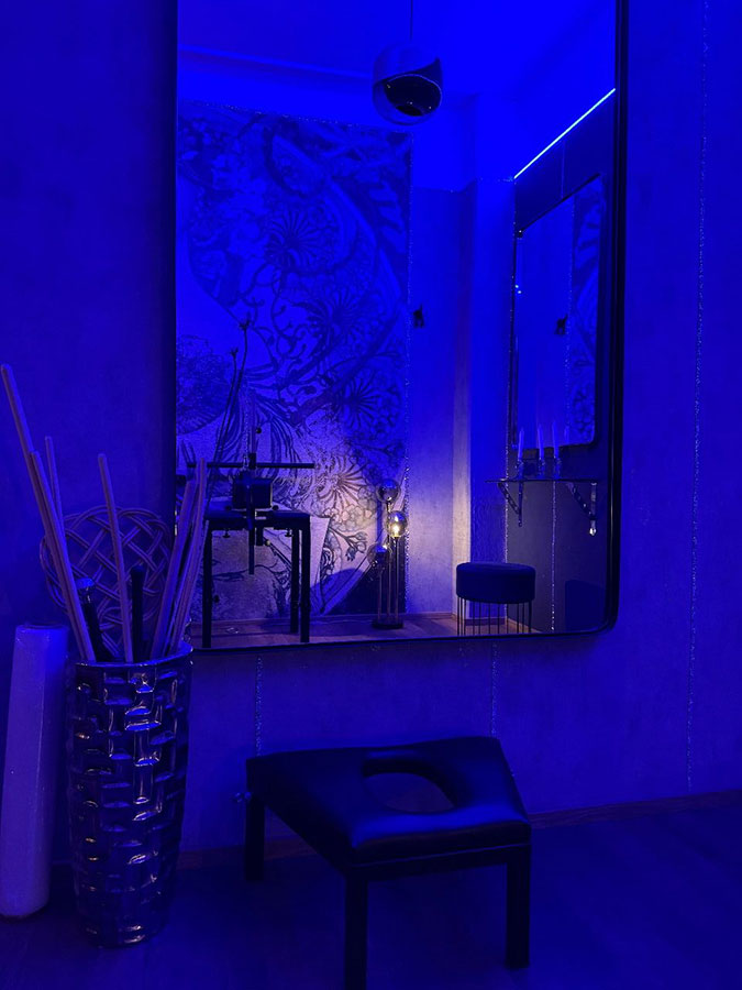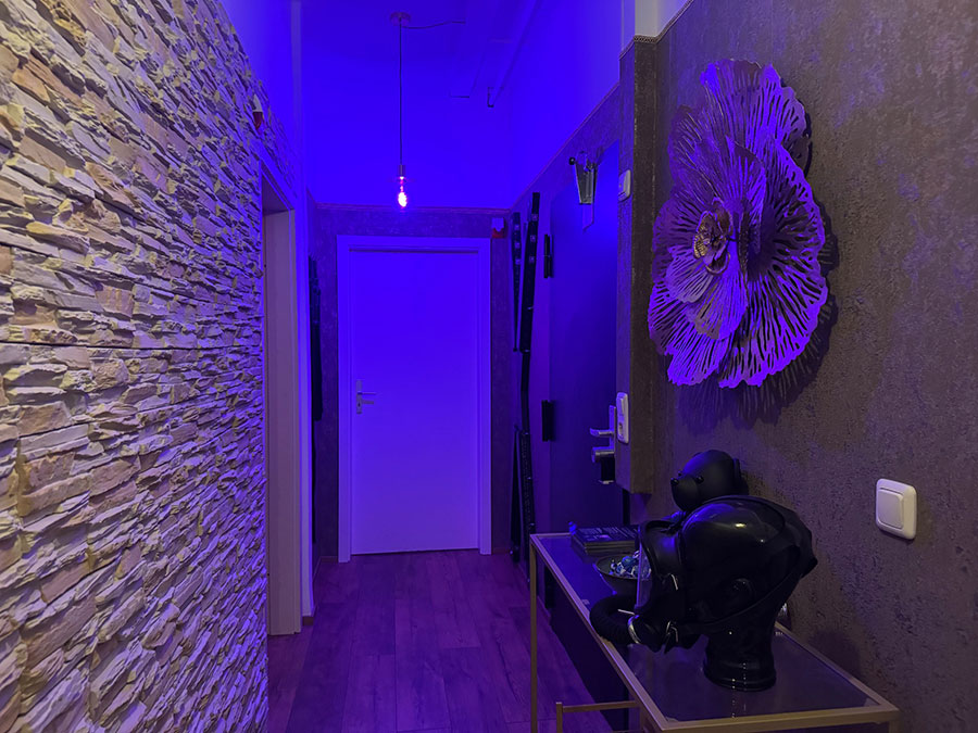 Das blaue Leuchten entführt dich in eine Welt voller exotischer Geheimnisse. Der blaue mystische Glanz, der über dem Raum liegt schafft ein einzigartiges Ambiente, das durch sanfte, hypnotische Musik verstärkt wird und schafft eine Atmosphäre, die sowohl beruhigend als auch äußerst erotisch ist.